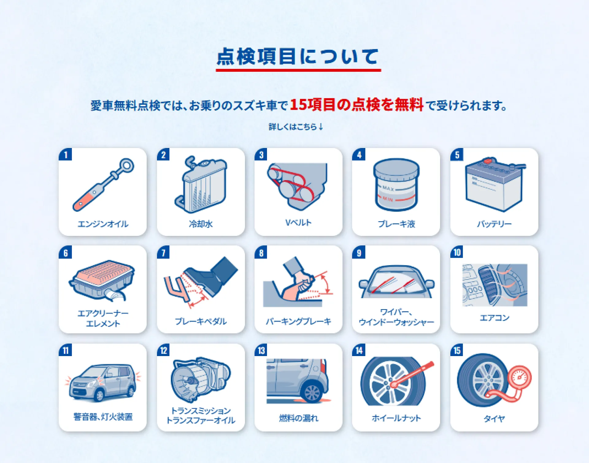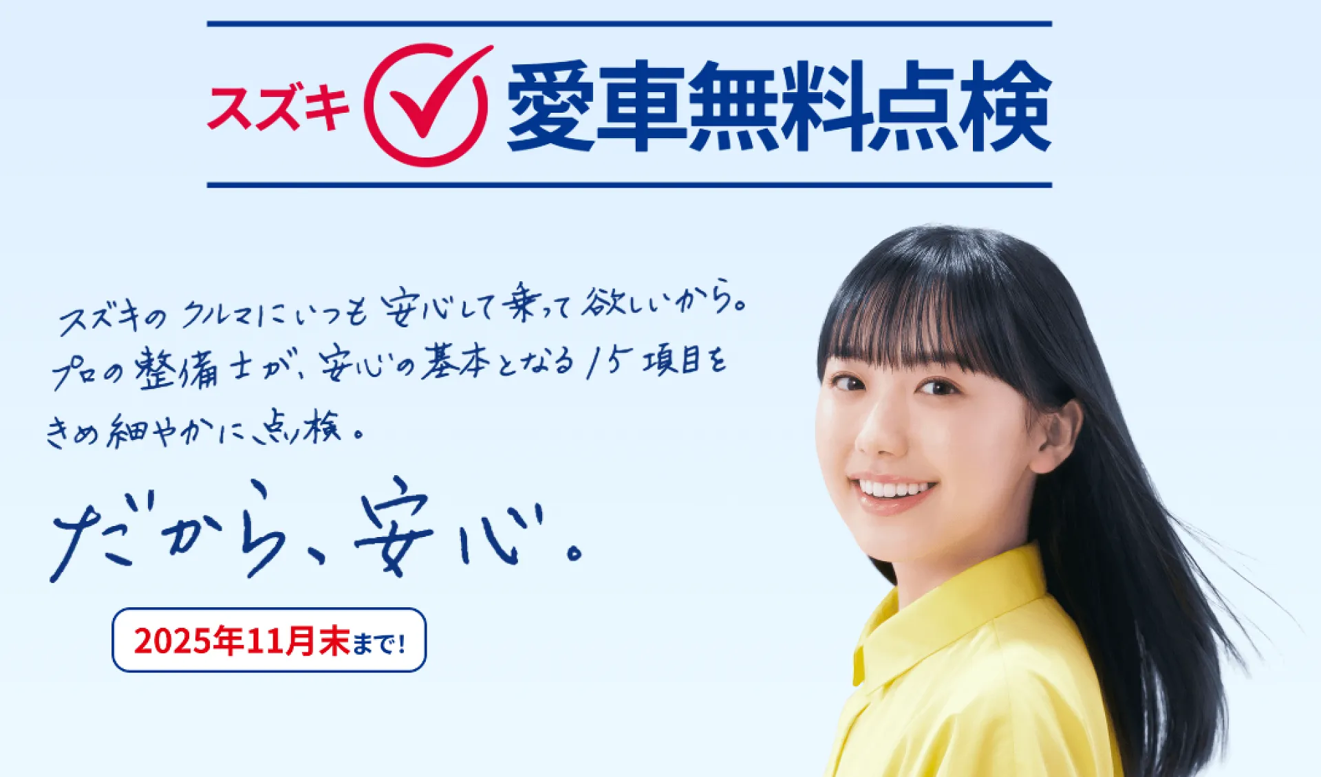 大変申し訳ございませんが、2024年以降の登録・届出車両およびスズキ安心メンテナンスパック加入者は愛車無料点検の対象外とさせていただきます。予めご承知おきください。